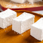 - Using a large knife dusted with the powdered sugar to prevent sticking, cut the marshmallow block into 20 even squares.